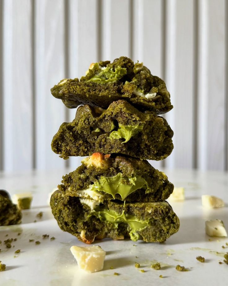 Soft cookies matcha super tebal dengan aroma matcha yang khas dan menggoda. Bagian atasnya dibaluri cokelat putih yang manis dan keju oles yang creamy, menciptakan perpaduan rasa yang unik dan bikin penasaran.